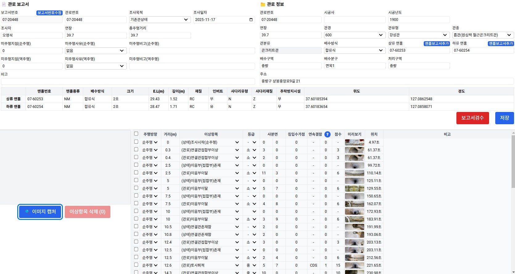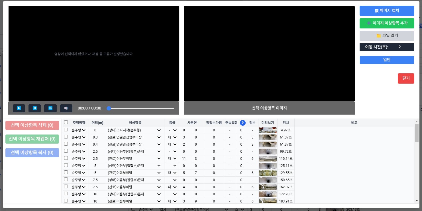 1. 관로 보고서 창에서는 판독한 내용이 이상없이 잘 보이는데, 이미지 캡쳐 관련 창으로 전환되면 등급이 전부 "대"등급으로 변경됩니다. 2. 관유형을 변경시 판독한 내용이 전부 균열 원주로 변경됩니다. 다른 관로 선택시 위 문제는 사라지긴 하나, 작업에 혼돈이 있을듯 하여 문의 올립니다.