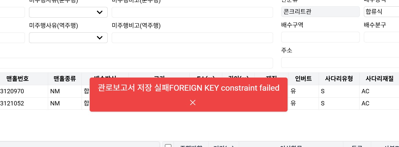 1.2.3 버전 업데이트 이후 프로그램 사용 중 관로보고서 저장 시 오류가 발생하여 저장이 되지 않습니다.