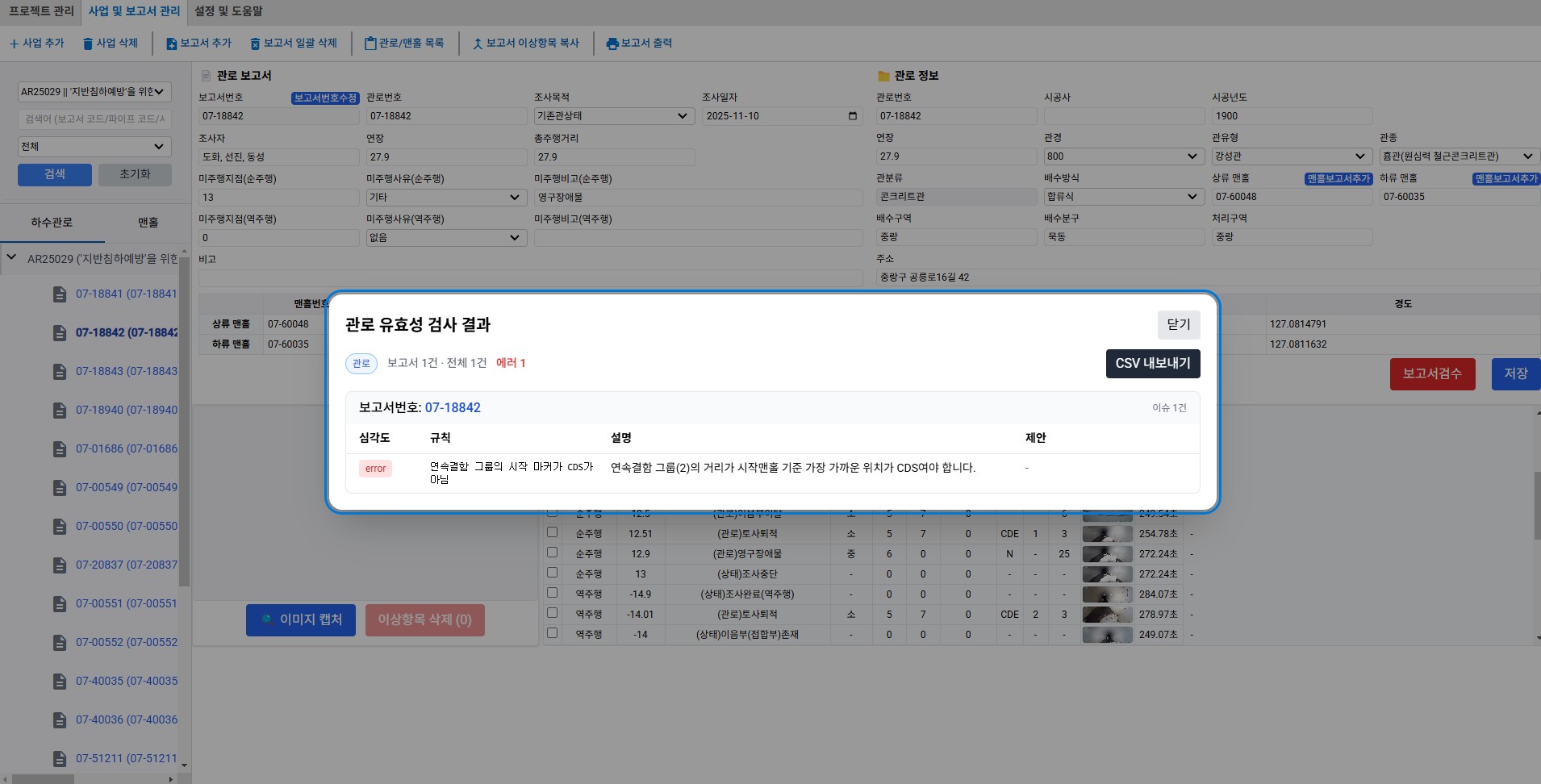 ※ 해당관로 DB 및 이상항목 집계표는 이메일로 송부드리겠습니다.